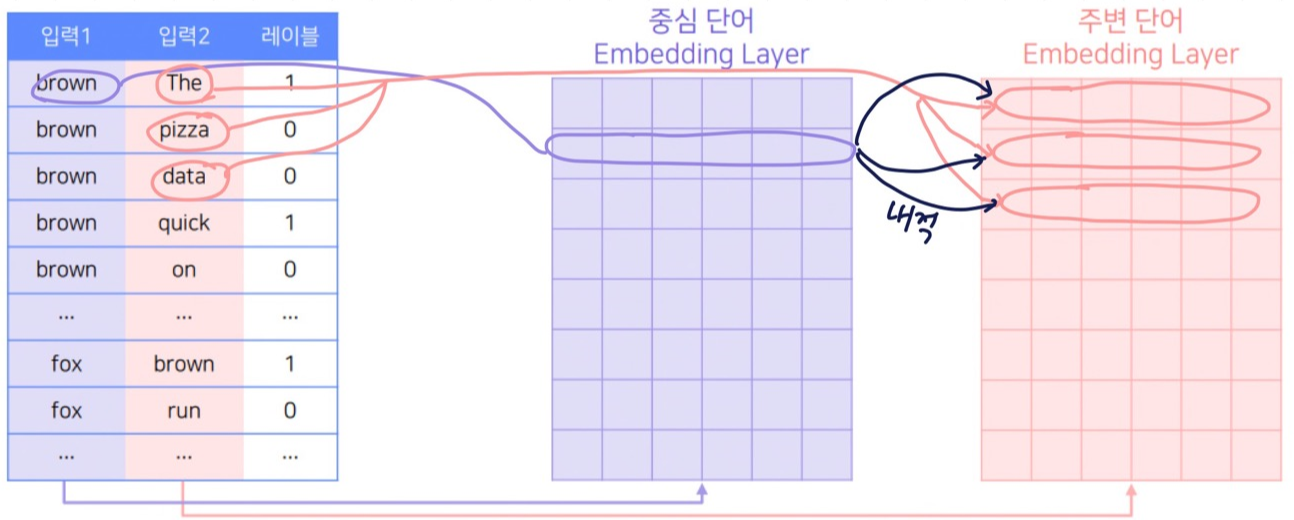 주변 단어와 예측하려던 단어의 조합들을 모두 입력으로 바꾸고 주변에 있다면 label을 1 아니면 0 으로 예측하게 하는 binary classification문제이다.