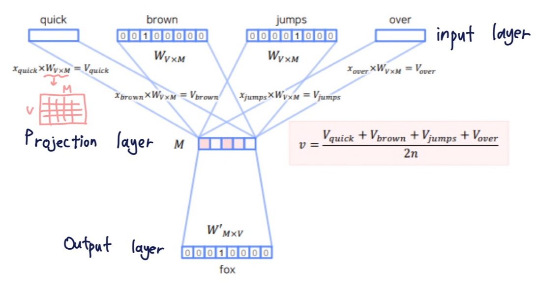 그래서 각 단어가 고유한 V vector들 4개가 projection layer로 모여서 갯수만큼 더해 평균을 구한 $v$가 최종적으로 projection layer가 된다. $v$를 가지고 최종 단어 fox를 예측하게 된다. 그러려면