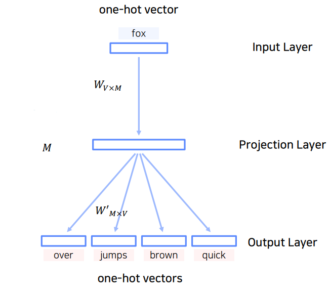 결과적으로 fox(입력 단어)로 주변 단어를 예측하는 문제를 해결하게 된다.