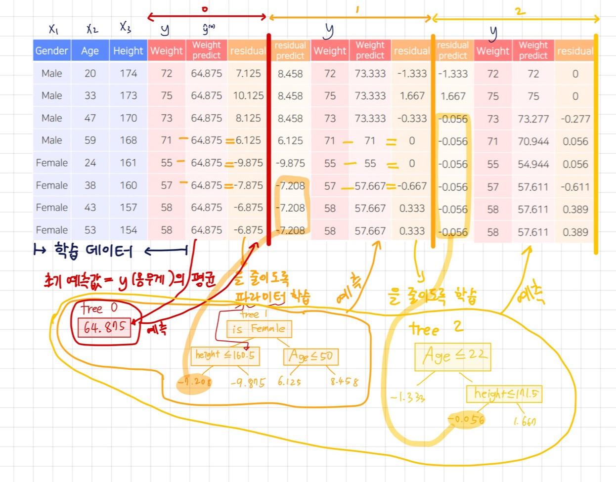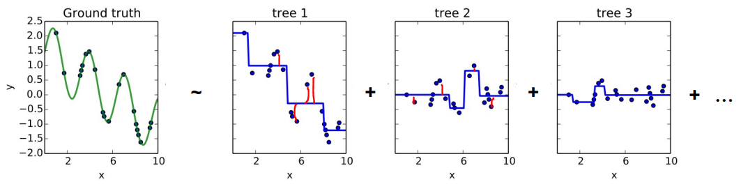 맨 왼쪽의 ground truth가 x와 y의 데이터에 대해 학습한 true function을 보여주고 있다. 예측모델을 학습해서 ground truth와 최대한 비슷하게 만들어야 한다. tree1,2,3는 각각 weak learner이다. tree1을 학습시켜서 residual(빨간색 선만큼의 차이)을 구한다. 이 값(residual)들을 다음 weak learner인 tree2를 학습시키는데 사용한다. 그리고 또 tree2에서의 residual을 구해서 tree를 학습시킨다. 이 과정을 반복하면 tree는 점점 많아지고, residual은 줄어들게 되며 ground truth와 비슷한 function이 학습되게 될 것이다.