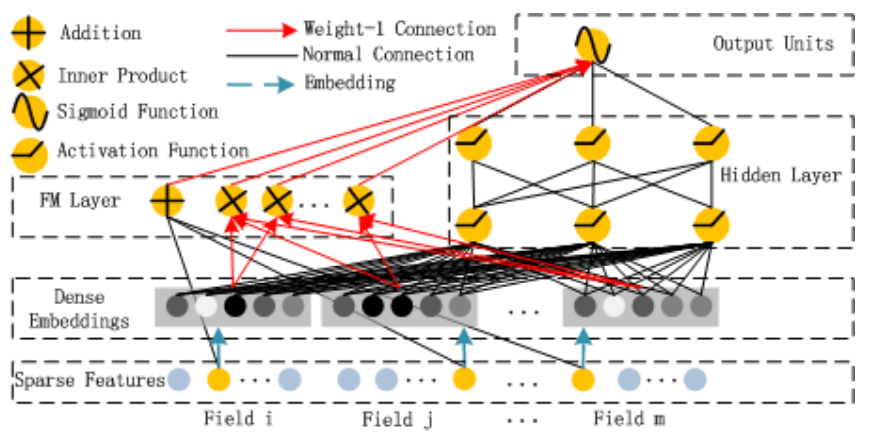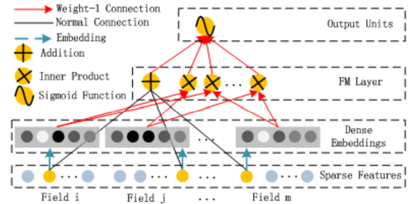 각 Field(Field i, Field j)들은 하나의 feature를 의미한다. DeepFM에서는 sparse 한 feature로 구성하고 있다.