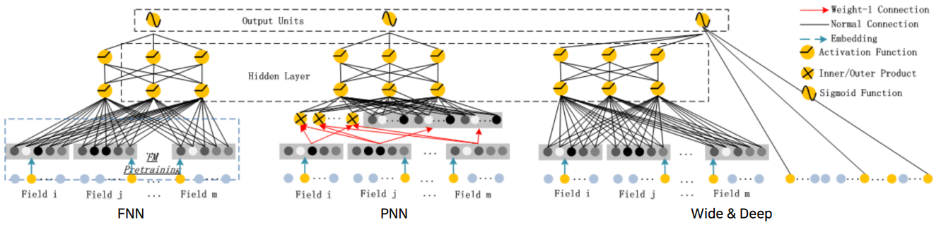 FM모델을 사용하지만 end-to-end 가 아니라 FM모델을 학습한 이후에 embedding 을 가지고 와서 다시 딥러닝 모델을 사용한다. 그래서 반드시 pre-training이 필요하다. - PNN