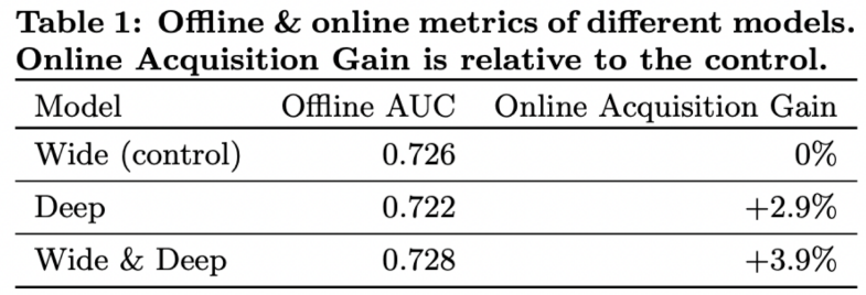 wide모델만 사용하면 offline에서 좀 더 좋은 성능을 보이고, online serving에서는 deep 모델이 더 좋았다. 하지만 wide&deep은 둘다 좋은 성능을 보였다.