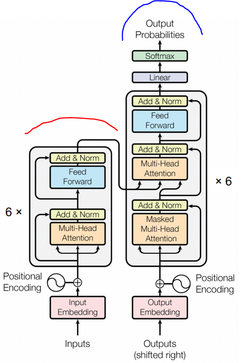 빨간부분이 encoder 파란 부분이 decoder로 이루어져 있다. encoder과 decoder은 각각 6개의 동일한 레이어를 쌓아서 사용하고 있다.
