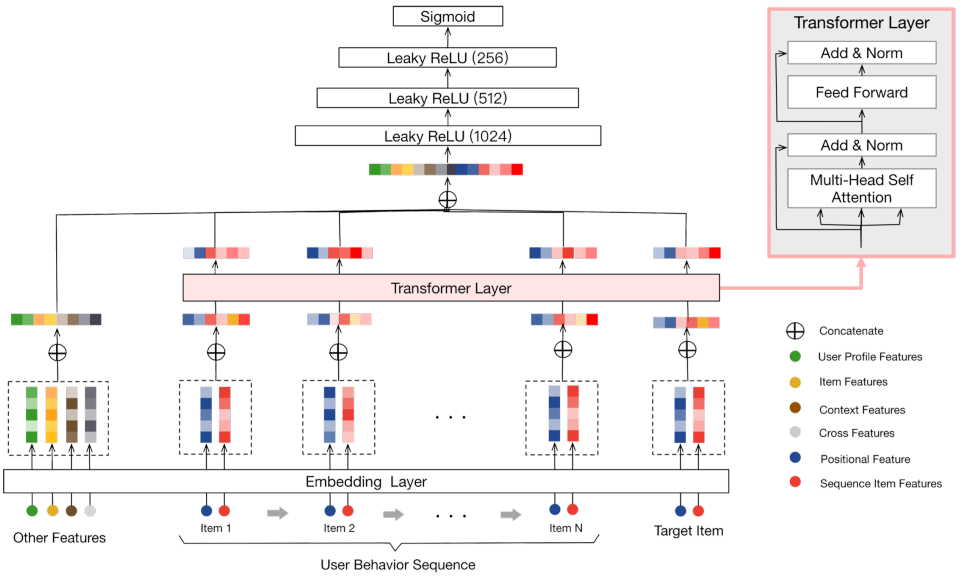 sequence feature는 예측하고자 하는 target item과 같이 묶여서 전체 리스트가 transformer의 input으로 들어가게 된다. Trasnforemr layer를 보면 원래 transformer의 decoder는 사용하지 않고 encoder만 사용해서 전체 sequence를 적절히 표현한다.