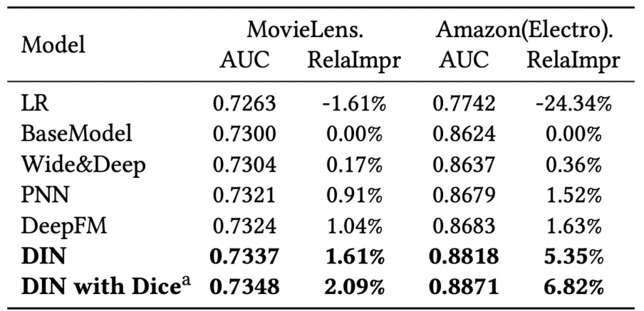 Logistic regression, wide& deep 등의 모델들보다 DIN이 높은 AUC성능을 보이고 있다. 맨 밑의 Dice는 이 DIN 논문에서 새롭게 제시한 activation function 이다.