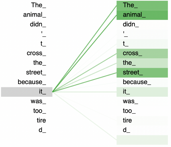 주어진 단어에 대해서 전체 단어와 얼마나 관계가 있는지를 가중치를 구해서 높을수록 진한 색으로 표시했다. 가중치가 높을수록 key가 가지고 있는 value를 더 많이 참고해서 query에 대한 표현을 계산할 수 있다.