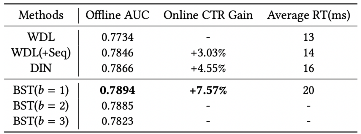 b=1, b=2처럼 블록을 점점 쌓을수록 오히려 성능이 감소한다. CTR예측 task의 sequence는 NLP sequence보다는 덜 복잡하기 때문으로 보인다. WDL는 wide&deep learing이고 WDL(+Seq)는 WDL에 sequence data를 추가한 것이다. transformer는 CTR 예측 문제에서도 SOTA의 성능을 보이고 있다!