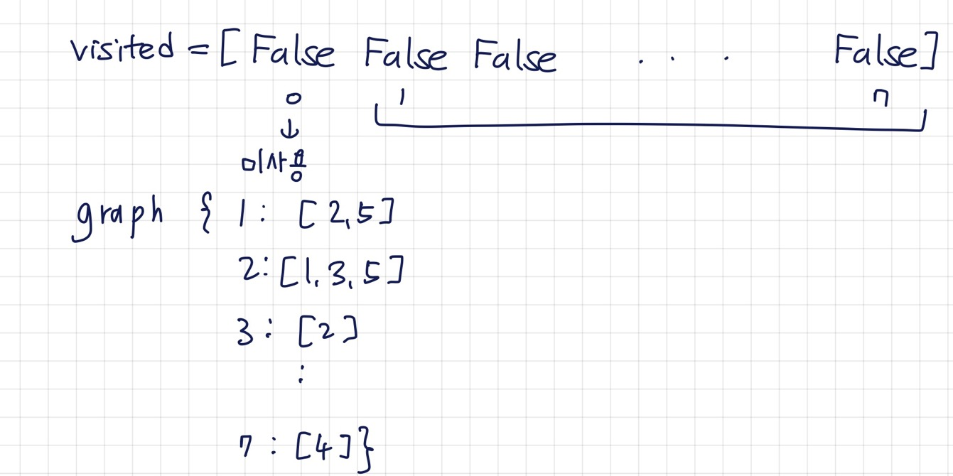 - visited=[]로 방문시마다 append해도 되지만 그렇게 되면 있는지 확인할 때 is in을 사용하는게 O(n)시간이 추가되어서 True,False로 확인하는 것이 낫다고 한다.