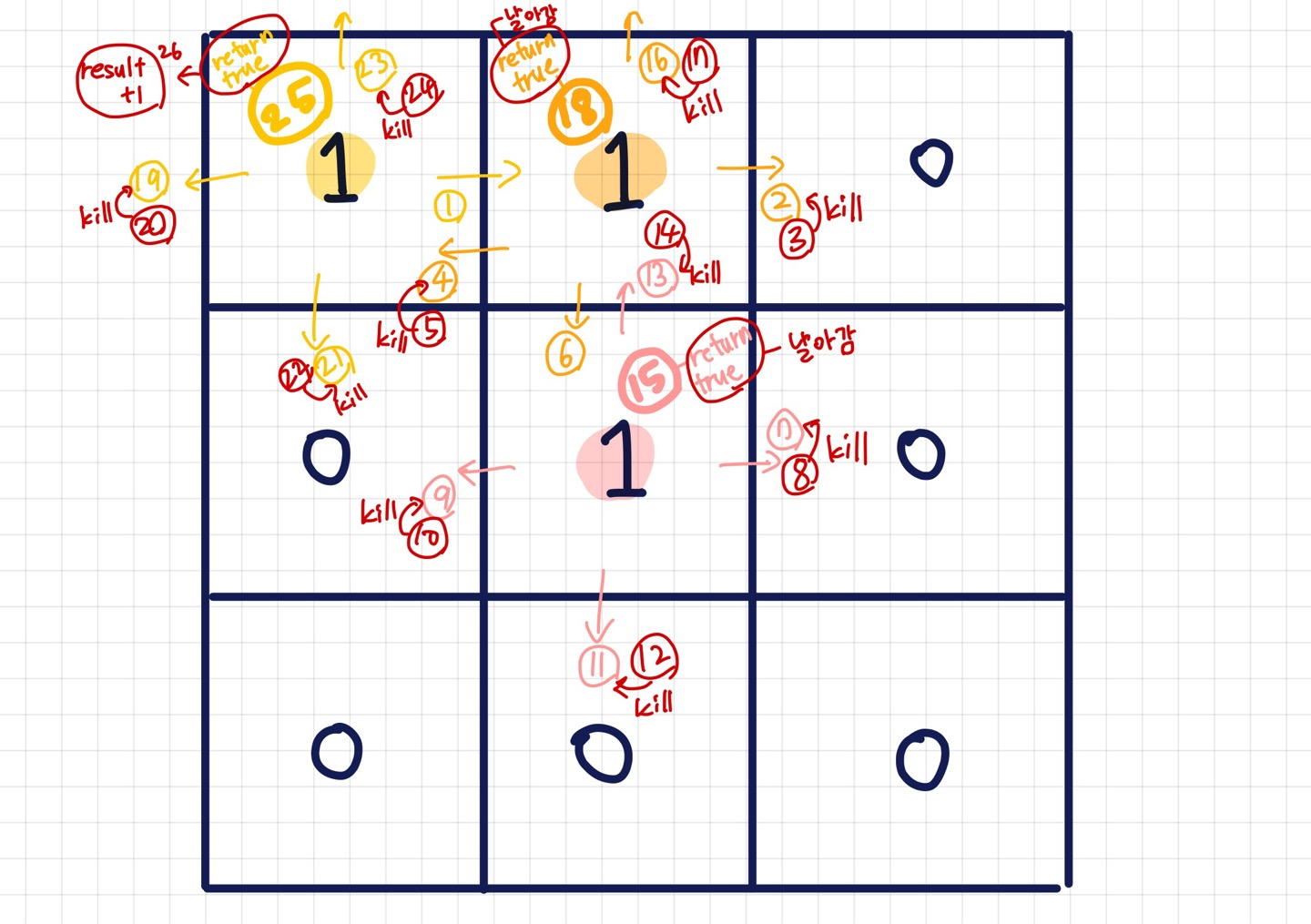 - 이코테 3강 유튜브에 나온 문제 얼음 얼려 먹기 였나 그거랑 너무 비슷했다. 그 때는 설명만 들어서 위의 사진에서 15번과 18번에서도 true가 나오는데 왜 1이 안 더해지는지도 이상했고, 2번같은 것도 return false인데 왜 되는걸까 고민했었다. 근데 그림 그리니까 확실히 이해가 갔다.