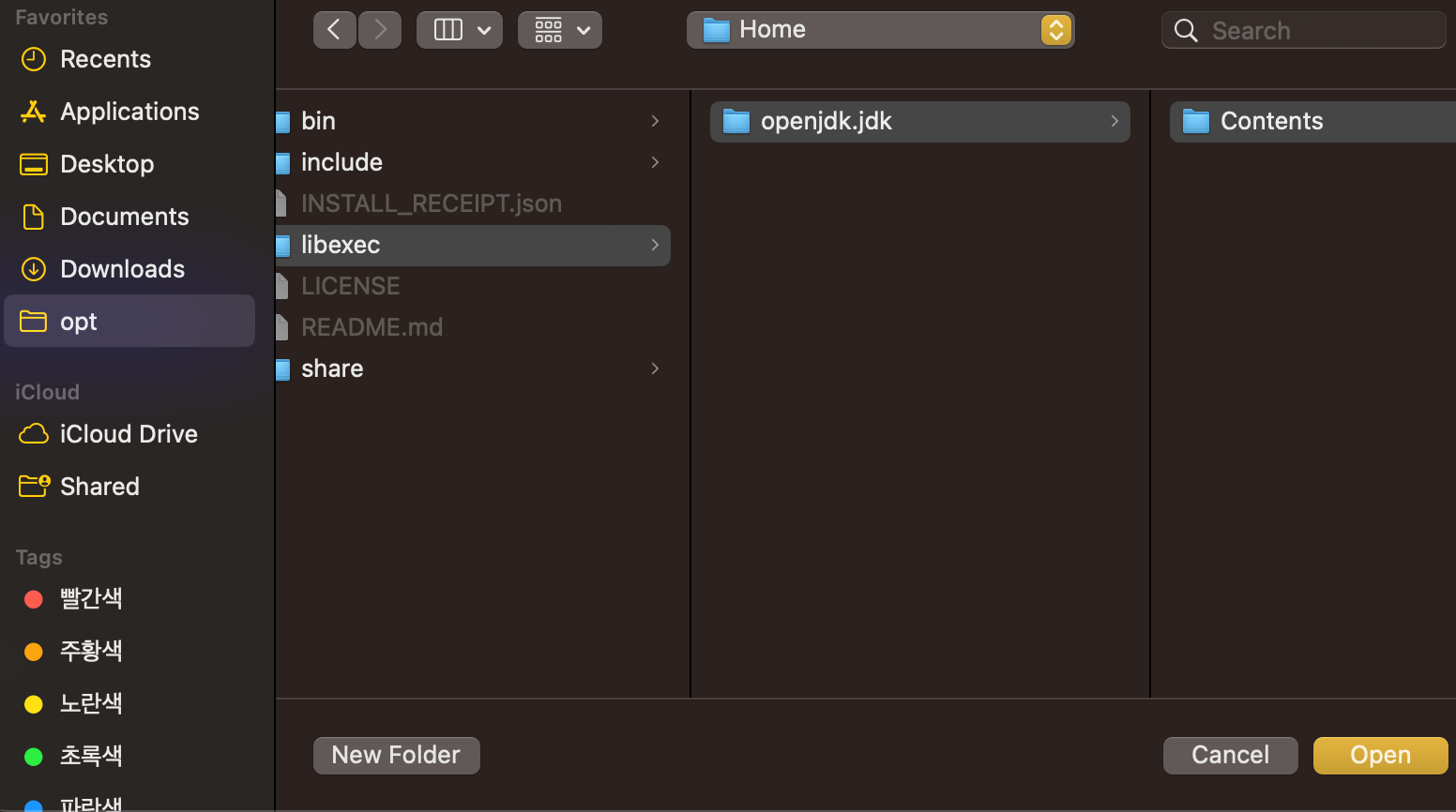 기본 설정이라면 "Add JDK"를 눌러도 홈디렉토리 ~ 이전으로는 들어갈 수 없다.