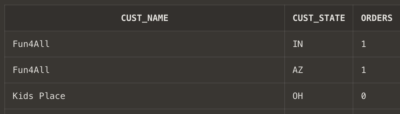 위의 쿼리에서 서브쿼리는 특정 cust_id의 전체 row수를 COUNT(*)로 세고 있다. 그 때의 cust_id를 기준으로 바깥쿼리에서 customer 정보를 가져오고 있다.