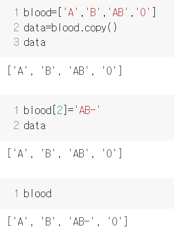 그러한 이유로 blood[1]만 바꾸었지만 data도 blood의 값들을 가리키고 있기 때문에 두 리스트가 동시에 바뀐다.
