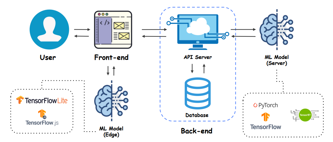 혹은 개인정보가 중요해서 database에 저장하지 않을 경우에는 front-end와 연결해서 ML Model을 적용시키기도 한다.